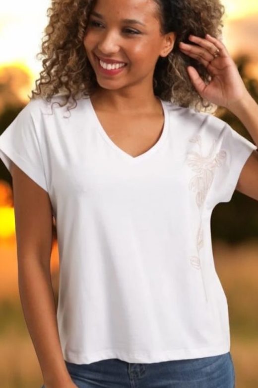 This v-neck t-shirt features loose short sleeves, an embroidered floral design on the side.